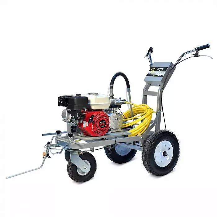 Schtaer Wega 3 - машина для распыления дорожной разметки краской. Разметочная машина с одним краскопультом предназначена для нанесения сплошных и прерывистых линий краской на дорогу, разметки пешеходников, нанесения дорожных знаков и надписей на дорогу, разметки парковок мест около магазинов и выставочных залов, разметки спортивных площадок и футбольных полей. Разметочную машину можно использовать только с краской, пригодной для безвоздушного распыления. Также машину можно использовать для разметки дорожных бордюров, мостовых конструкций, столбов фонарного освещения, можно также ее использовать как бензиновый окрасочный агрегат и красить фасады зданий и бетонные заборы. Максимальная длина шланга 90 метров. Сопло 1908.